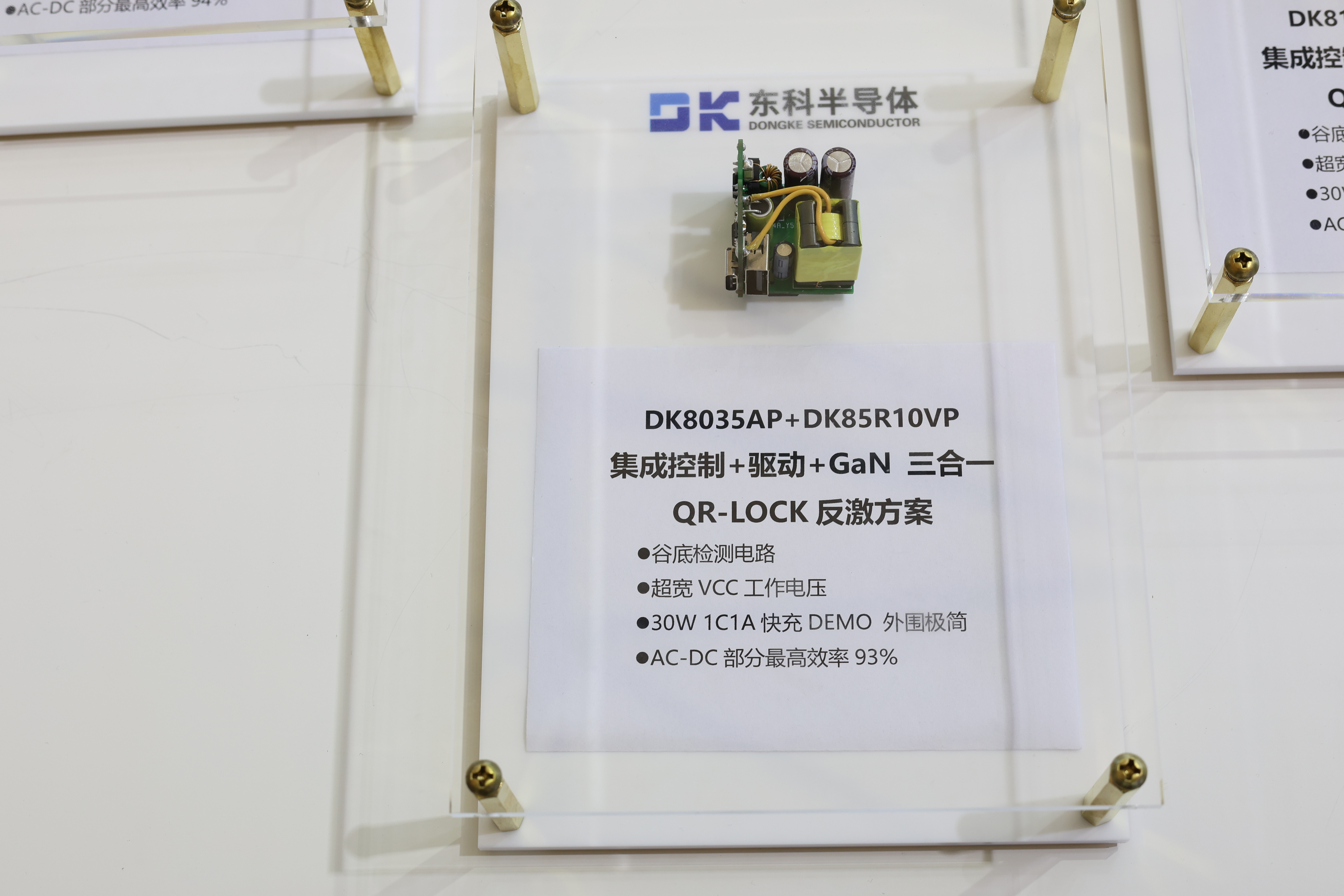 在氮化鎵AC-DC電源管理芯片領域,東科還帶來了全合封QR-LOCK AC-DC 電源管理芯片DK0XXG/DK80XXAP系列。產品輸出功率覆蓋12-75W。支持250KHz開關頻率,待機功耗低于50mW,內置高低壓輸入功率補償電路。